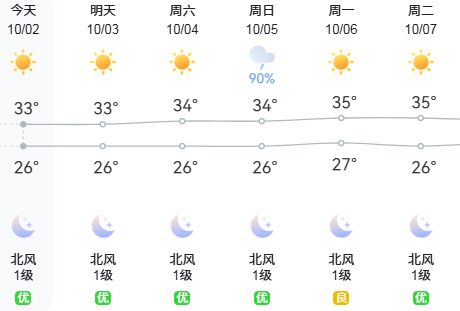 预计未来7天,泉港都会处在副热带高压控制下,本站最低气温会在26-27℃,最高气温会在35℃。国庆中秋假期天气以多云晴天为主,气温较高,大家外出要做好防暑降温措施,谨防中暑,安全游玩!