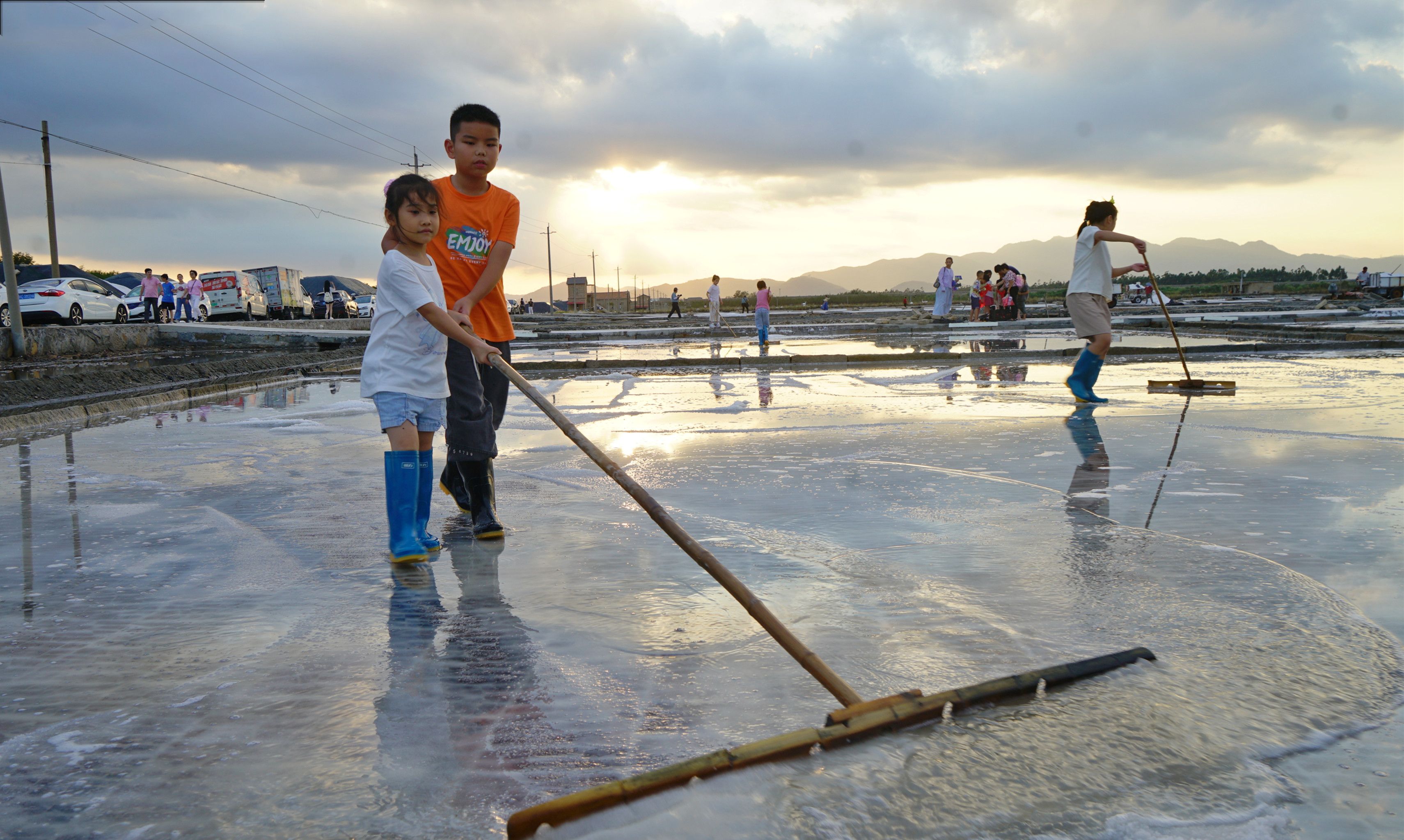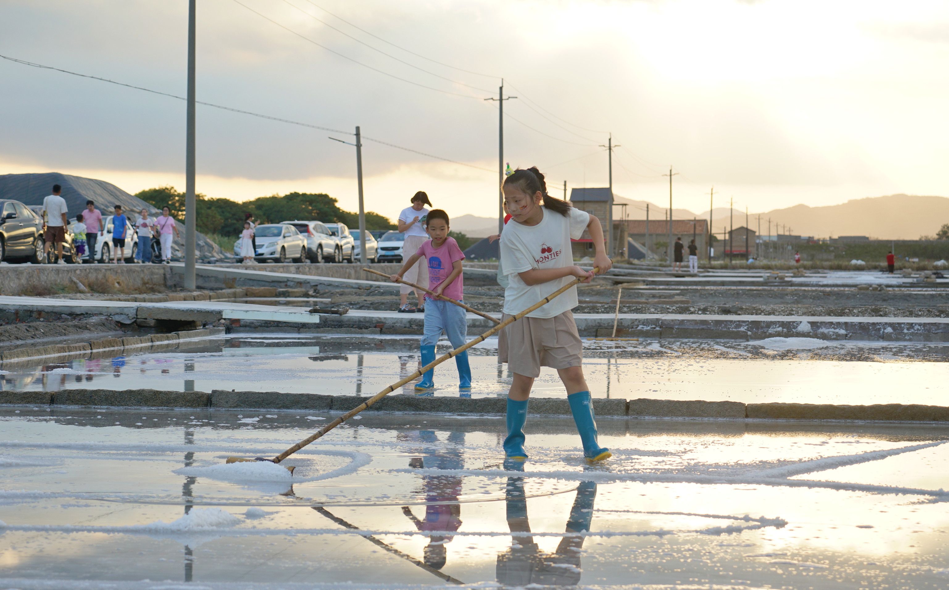 “盐田趣境”亲子露营活动则让孩子们与非遗相遇。夕阳下,孩子在家长陪伴下漫步盐田,聆听制盐历史,亲手体验制盐过程,化身“小小盐究生”。